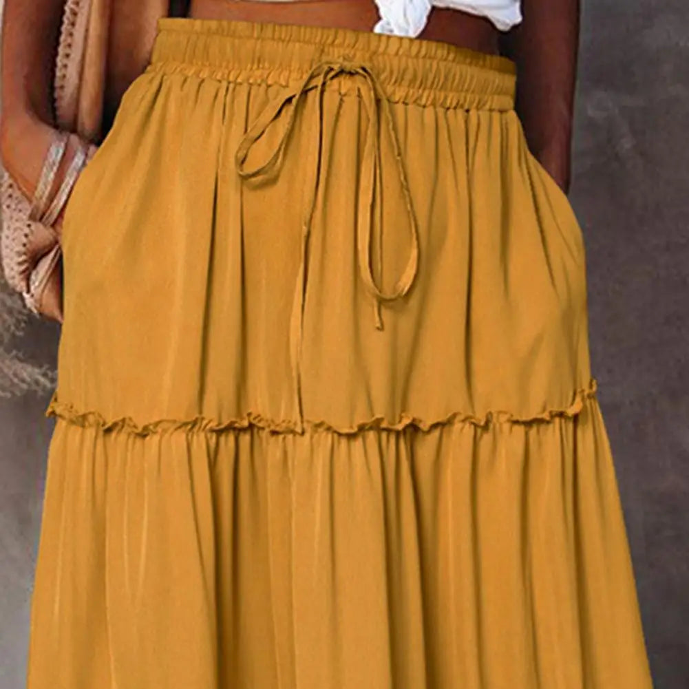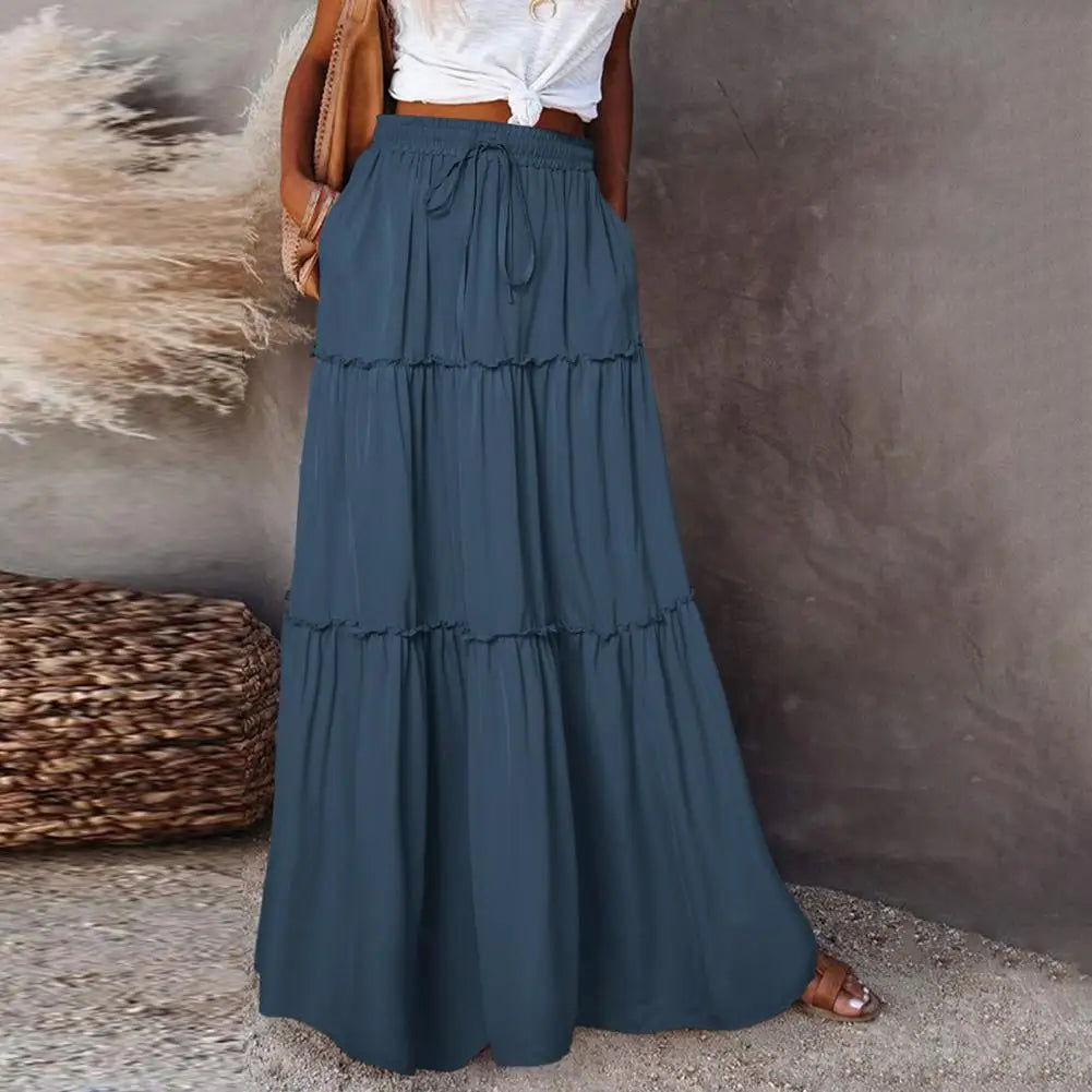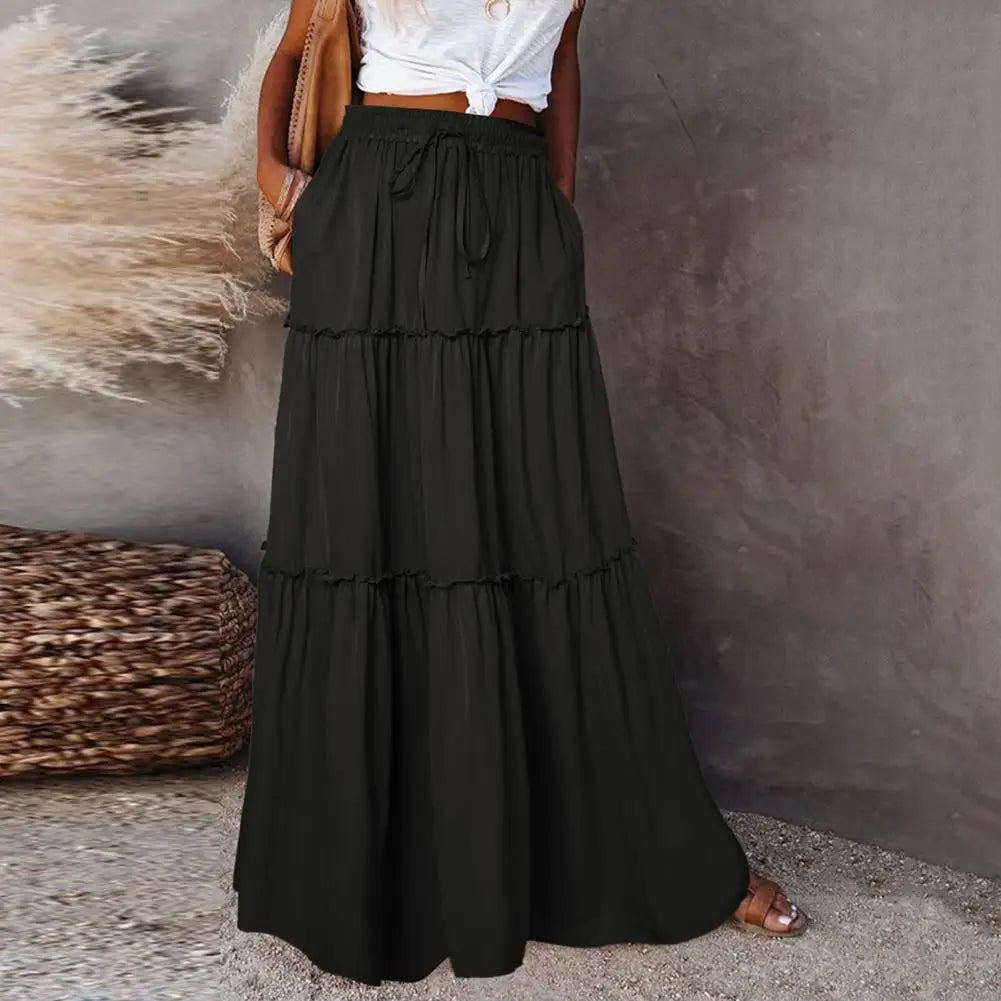 Women High Waist Elastic Waistband Maxi Skirt Solid Color A-Line Solid Color Ruffle Stitching Holiday Party Long Skirt Streetwear