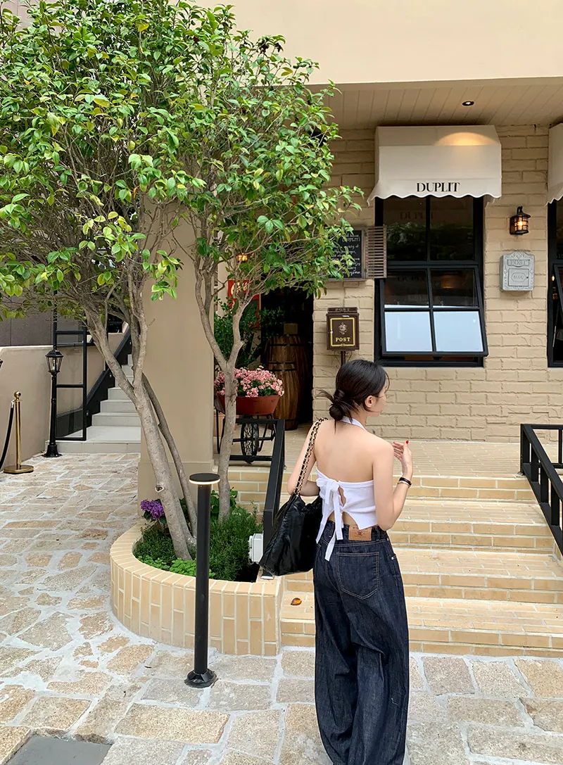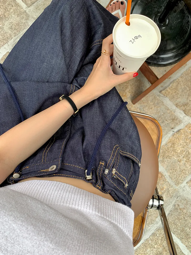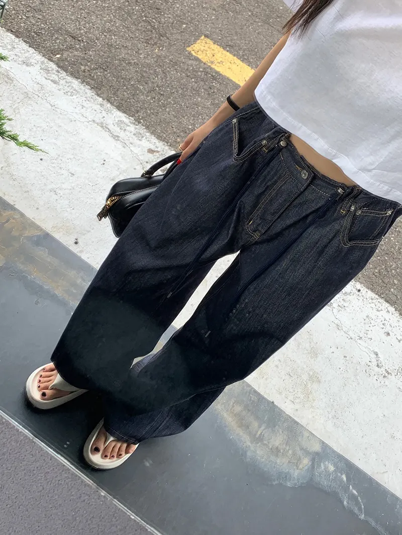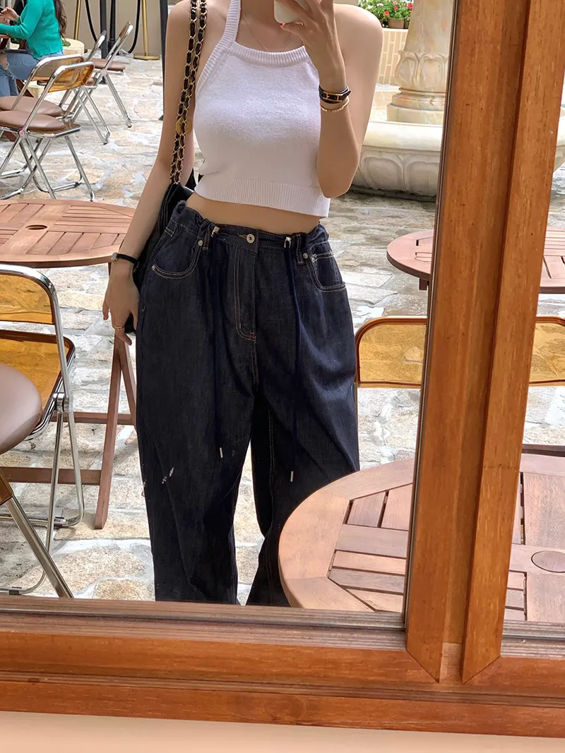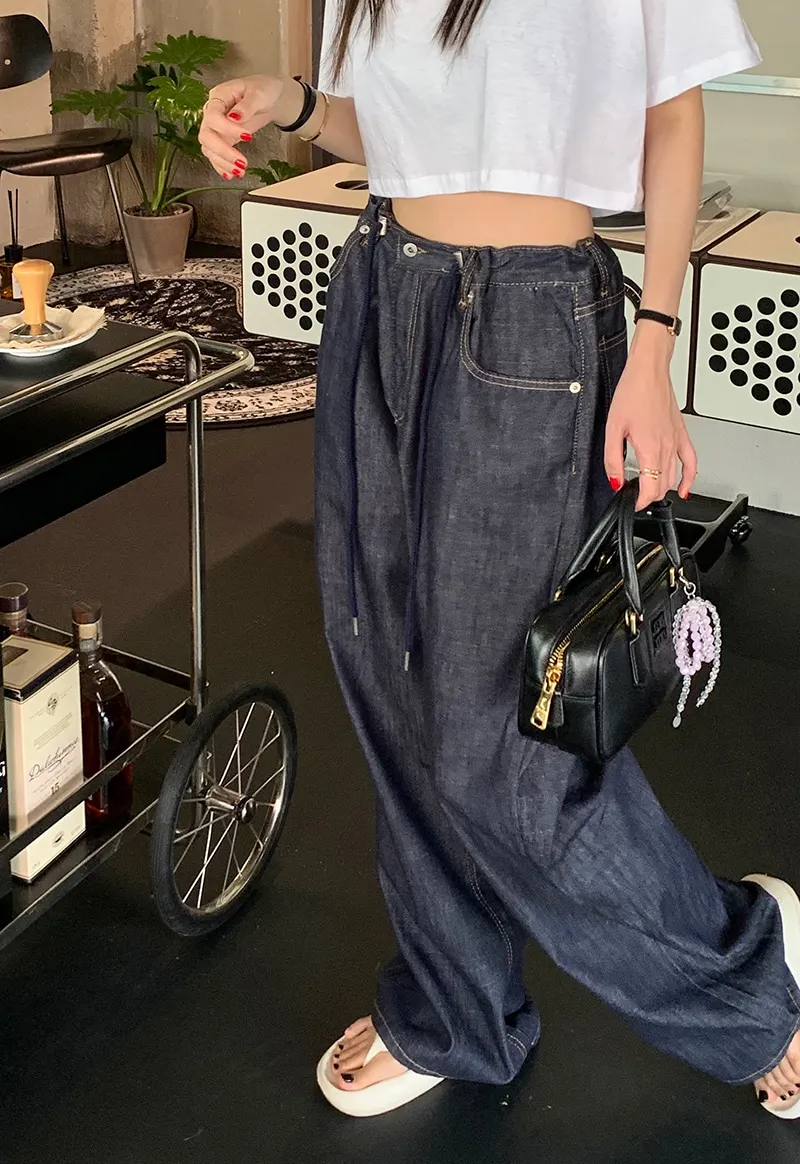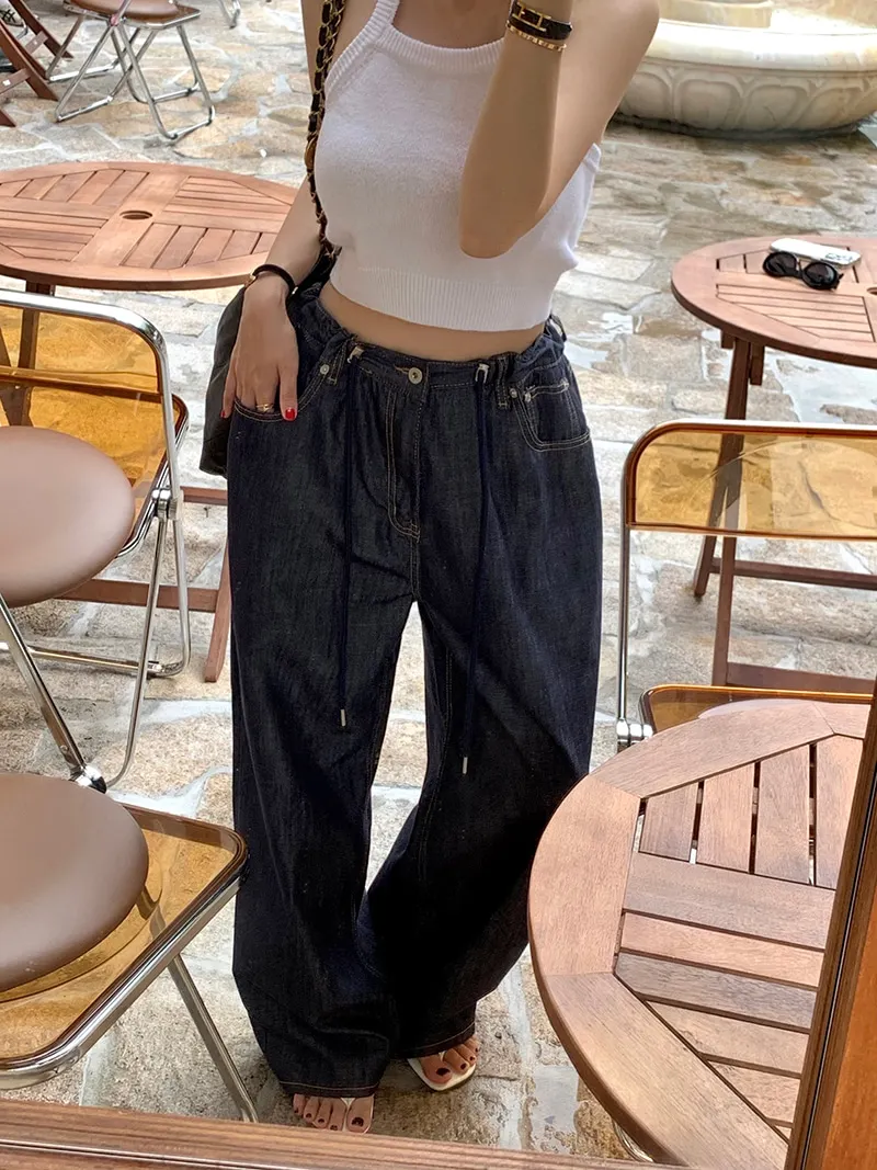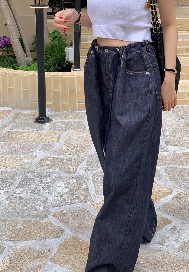 Equipped with a versatile drawstring, these jeans offer a customizable fit, ensuring comfort and style.