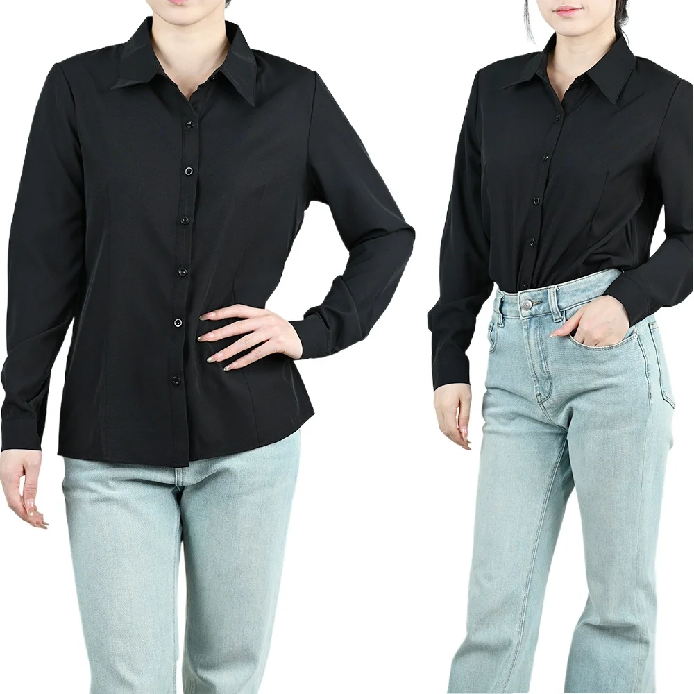 2. Button-down shirt style: elegant wide-collar button-down shirt, professional casual business style, slim cut, tucked into skinny jeans, simple and cool