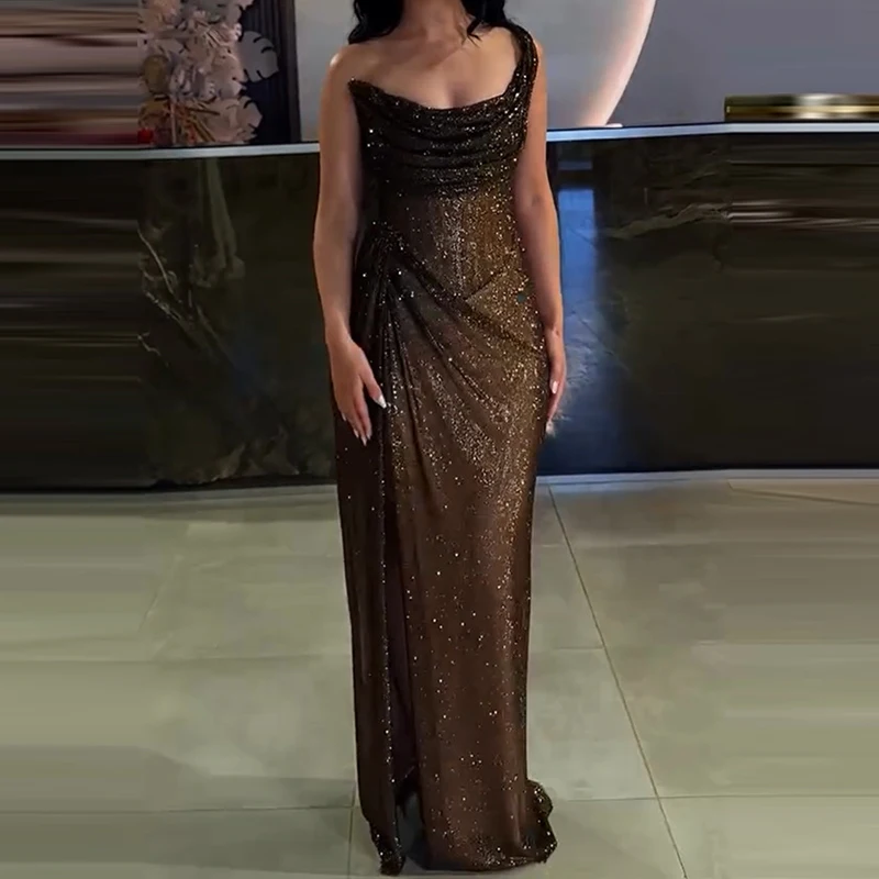 Sexy Elegant Full Length High Split Party Dress Chic Girdling Banquet Maxi Dress Luxury Women One Shoulder Glitter Slim Dress