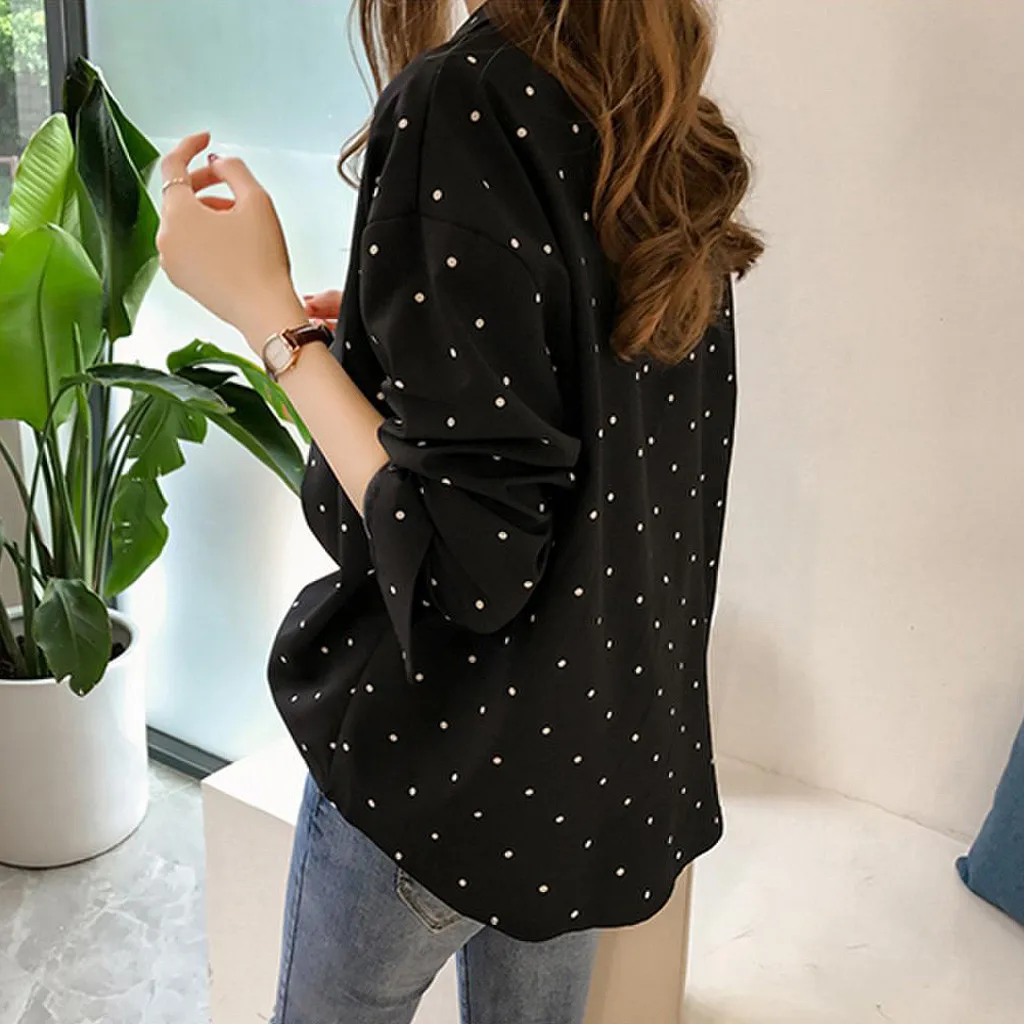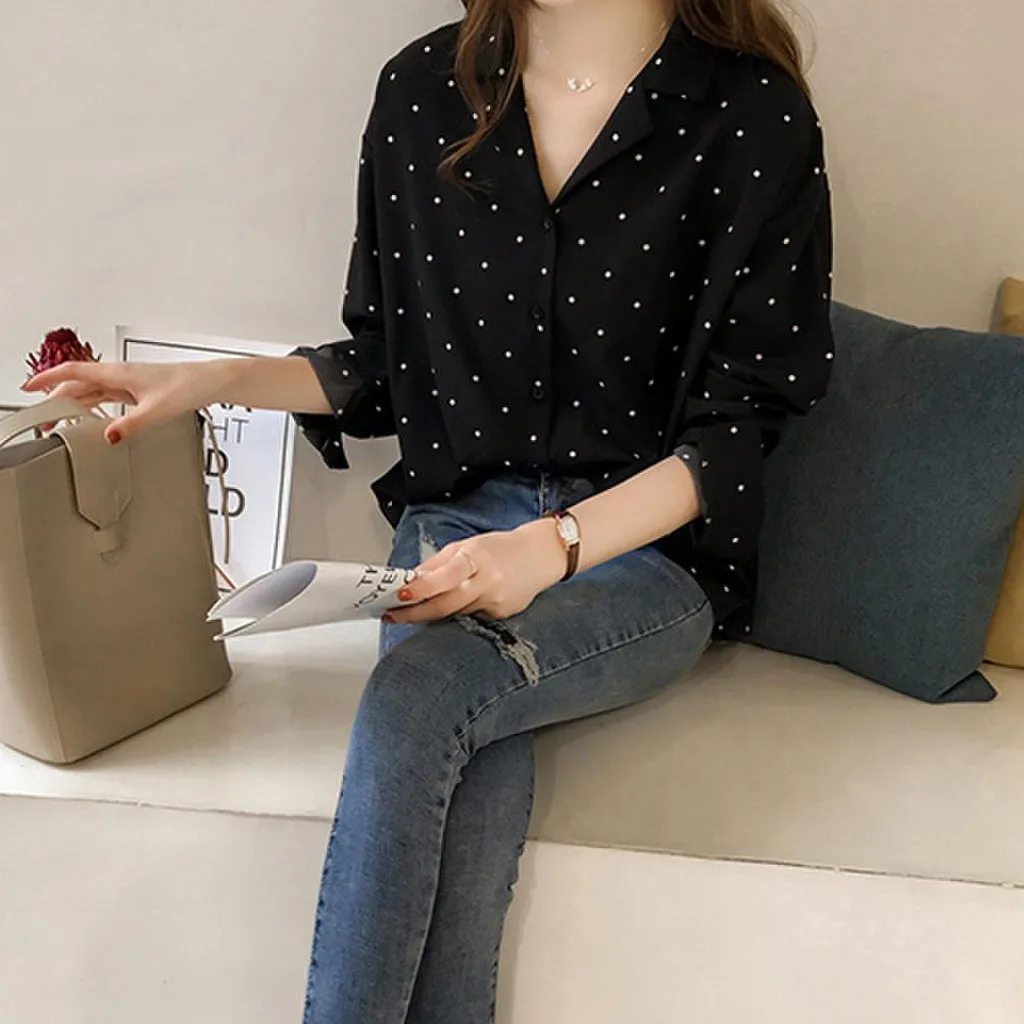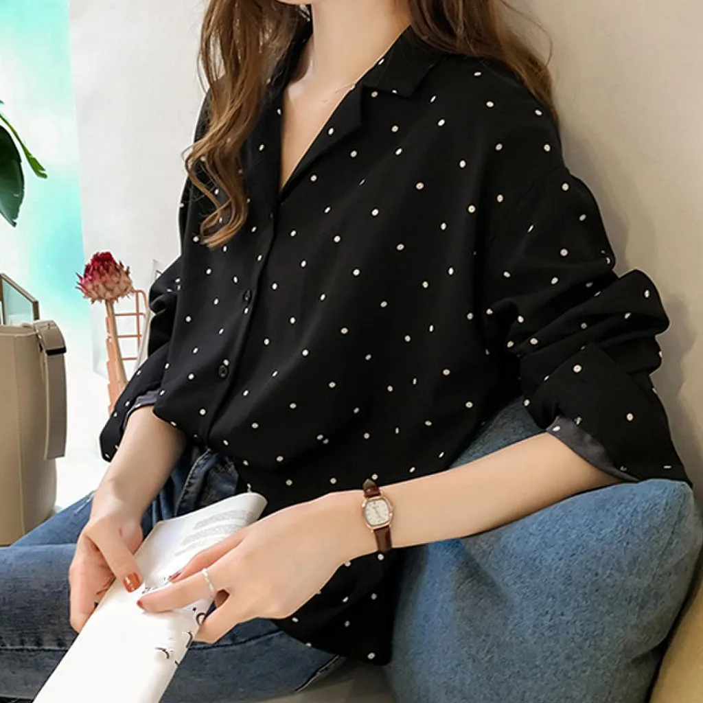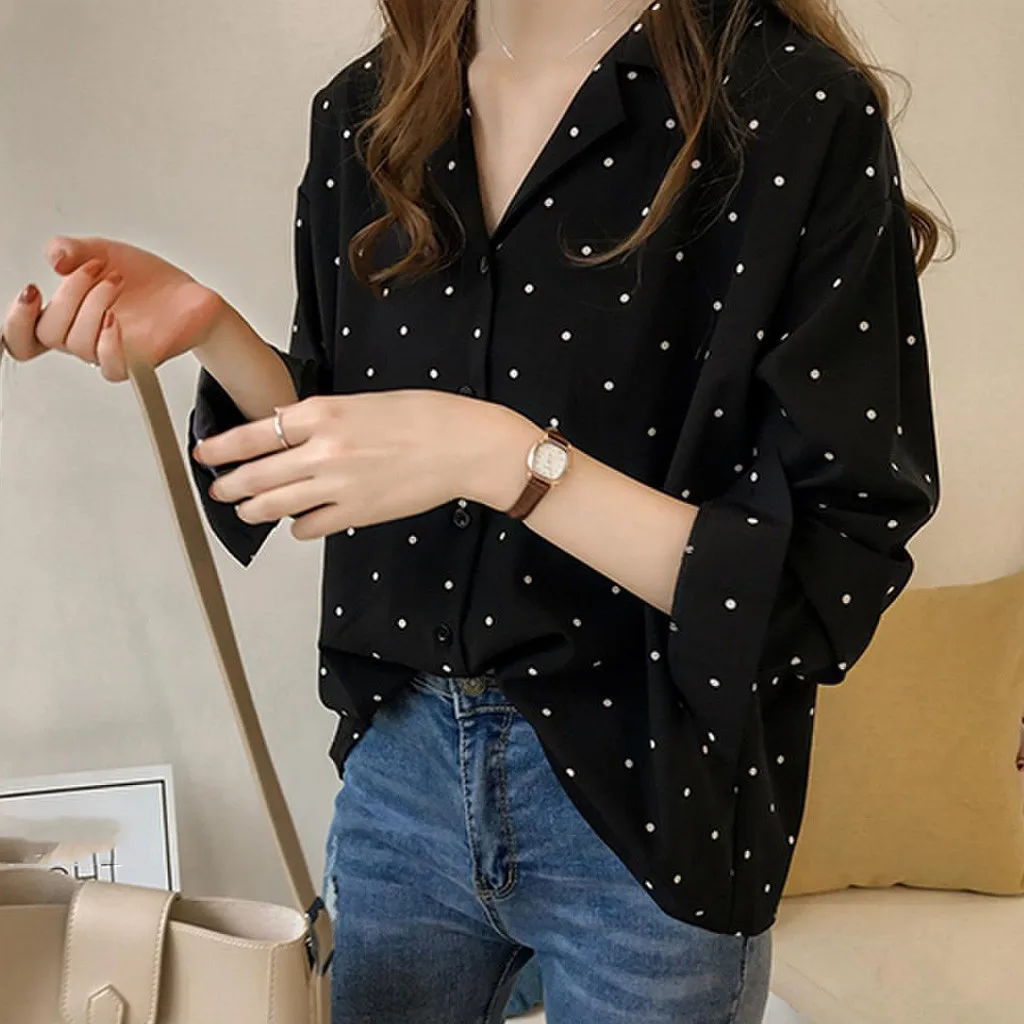 Women Casual Long Sleeve Polka Dot Turn-Down Collar Casual Tops Button Shirts