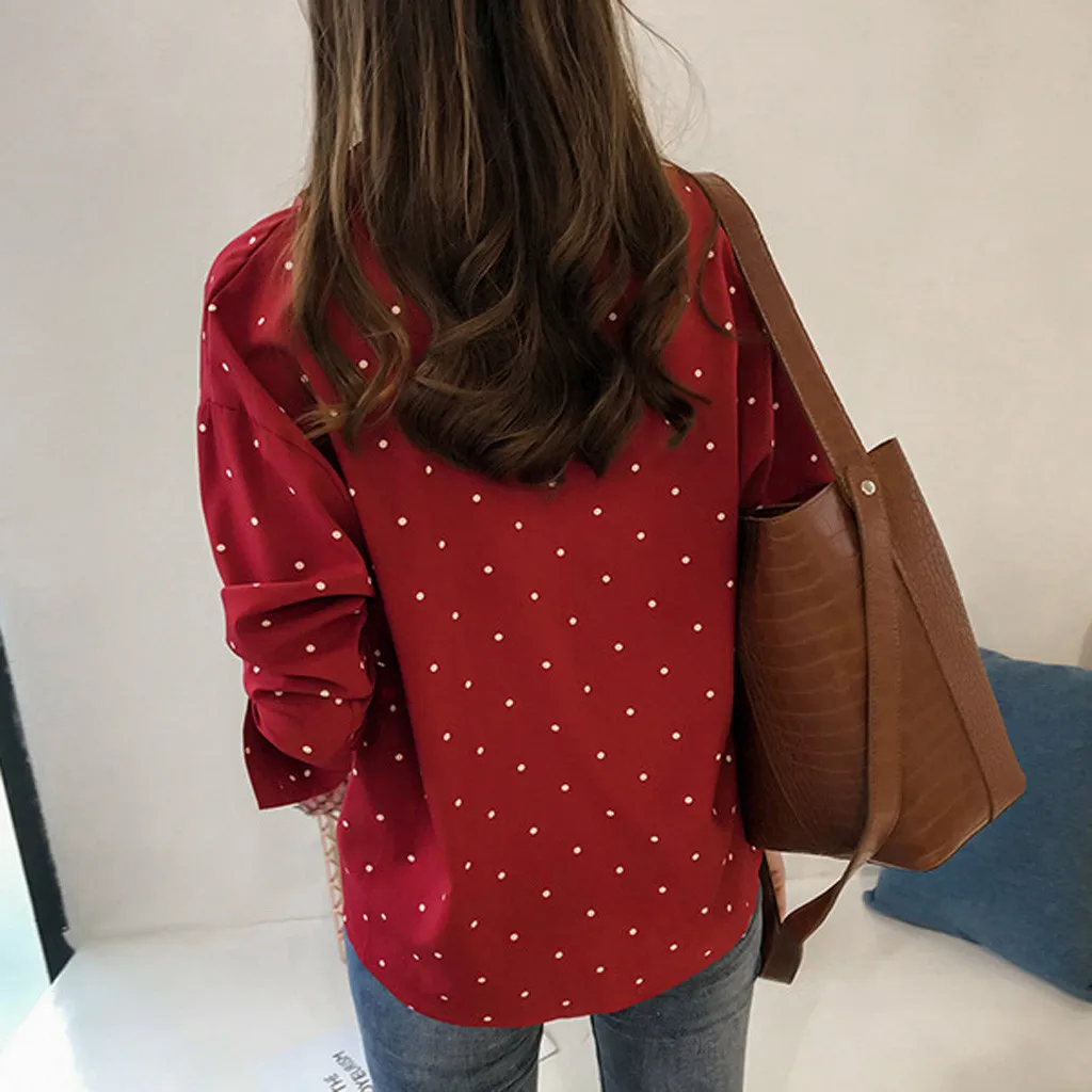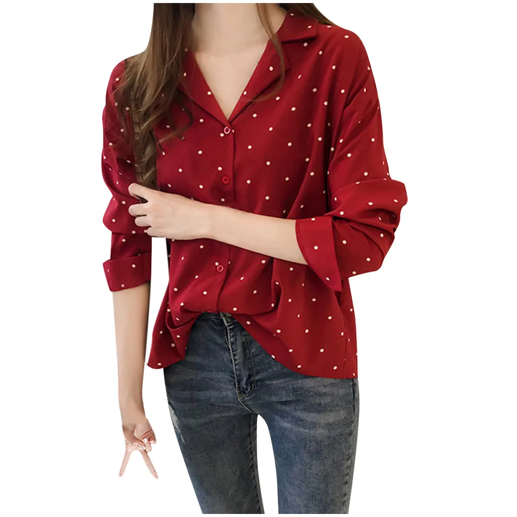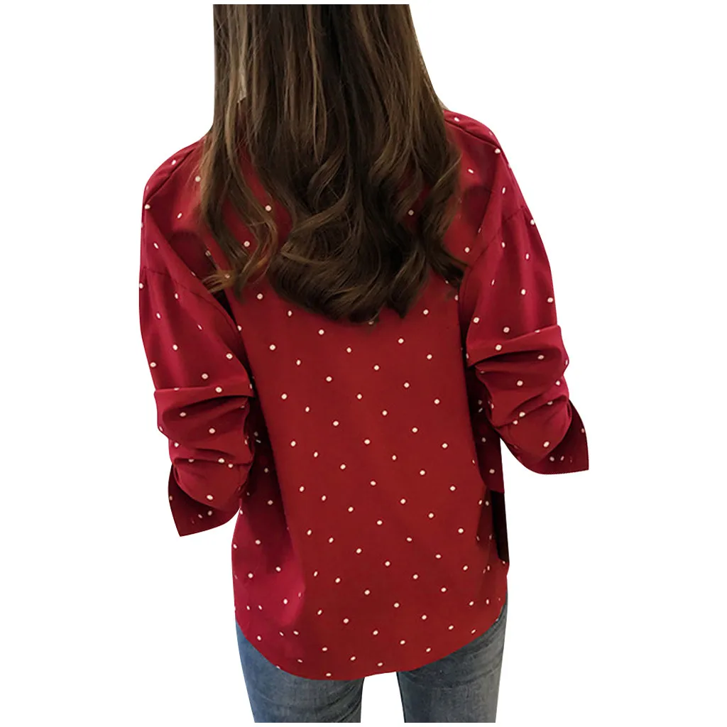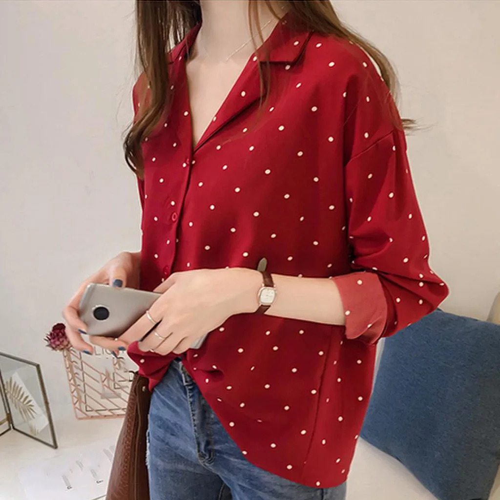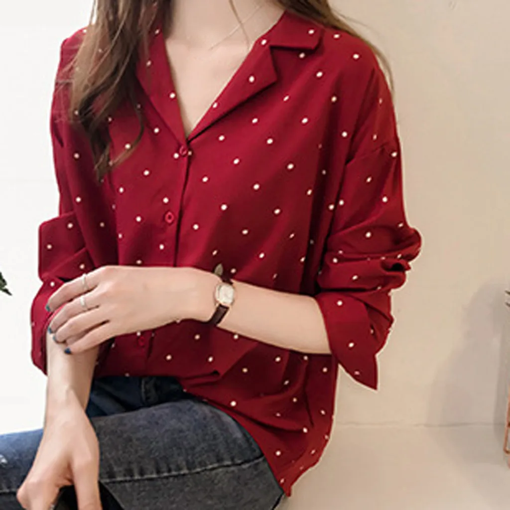 Women Casual Long Sleeve Polka Dot Turn-Down Collar Casual Tops Button Shirts
